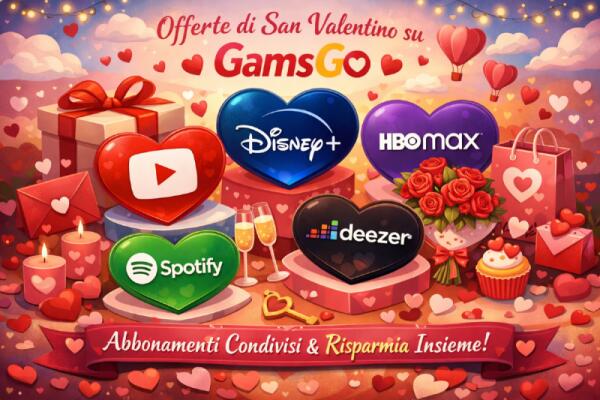 Offerte San Valentino GamsGo fino al 17 Febbraio: sconti fino al 10% su YouTube, Disney+, HBO Max, Spotify e Deezer. Risparmia ORA!