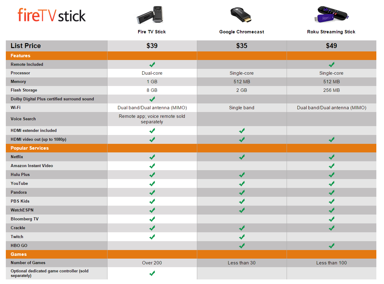 Anche rispetto alla Roku Streming Stick troviamo una dotazione nettamente migliore. Per meglio videnziare le differenze tra queste tre chiavette abbiamo anche una tabella comparativa proposta da Amazon che ci aiuterà a capire le sostanziali differenze tra questi dispositivi.