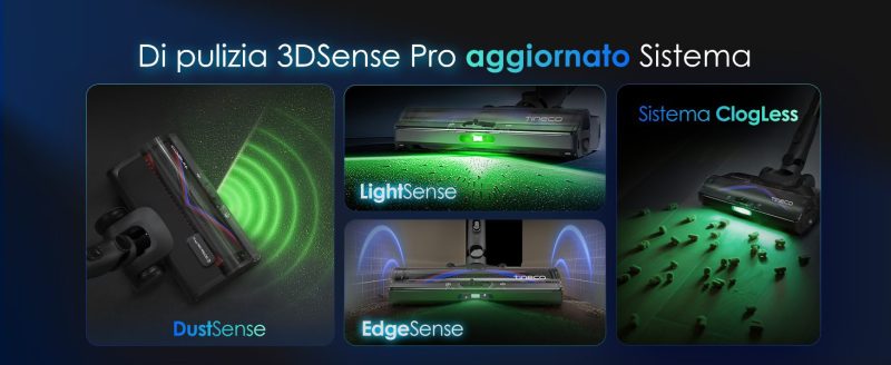 La potenza da 200 AW si unisce al sistema 3DSense Pro, una tecnologia proprietaria che rileva automaticamente la polvere e adatta la potenza di aspirazione in base al volume di quest’ultima.