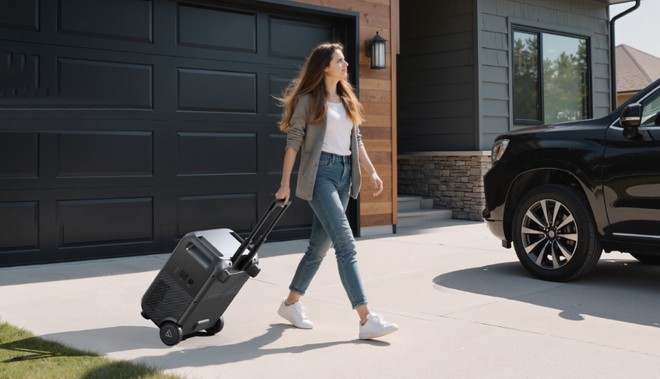 La power station adotta un formato a valigia con maniglia telescopica, ruote robuste e impugnature integrate, rendendo il trasporto più semplice anche su superfici irregolari come ghiaia o cemento.