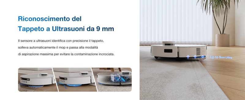 Anche i tappeti sono al sicuro: grazie al sollevamento automatico dei mop di 9 mm, il robot li evita, proteggendoli dall'umidità.