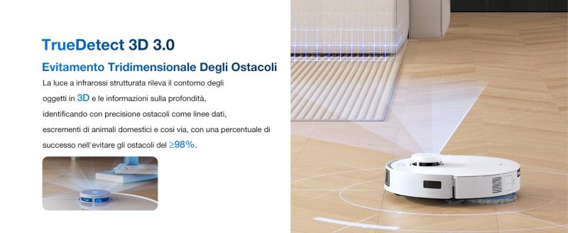 E con TrueMapping 2.0 e TrueDetect 3D 3.0, il DEEBOT T30C Pro OMNI si muove con intelligenza nella tua casa, mappando gli ambienti in pochi minuti e rilevando ostacoli come cavi o piccoli oggetti, garantendo una pulizia efficiente e senza interruzioni.