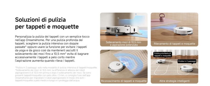 Per la cura dei tappeti, il robot vanta un sistema di riconoscimento a ultrasuoni che identifica automaticamente tappeti e moquette, sollevando i mop fino a 10,5 mm per evitare di bagnarli.