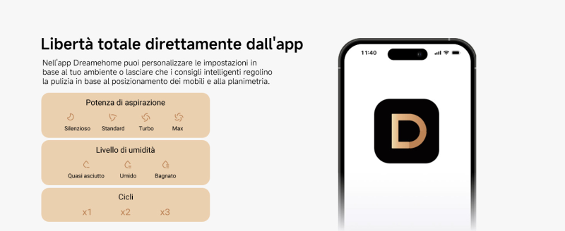 Il Dreame L40 Ultra AE offre un controllo intuitivo tramite l'app dedicata, che consente di personalizzare ogni aspetto della pulizia, dalla potenza di aspirazione all'umidità dei mop, dalle aree di pulizia ai cicli e alle strategie specifiche (ad esempio, per la presenza di animali domestici).