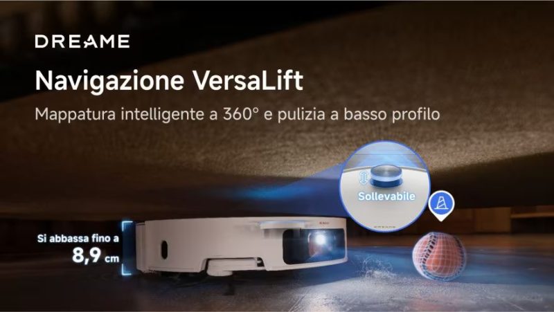 Il sistema di navigazione VersaLift permette inoltre al robot di abbassarsi fino a 8,9 cm, consentendogli di pulire agevolmente sotto mobili bassi come letti e divani.