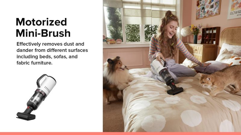 In confezione, infatti, è presente una mini spazzola motorizzata che rimuove efficacemente polvere e peli da letti, divani e mobili in tessuto, mentre la testina di pulizia 2 in 1 è perfetta per aspirare e spolverare fessure, automobili e superfici particolari.