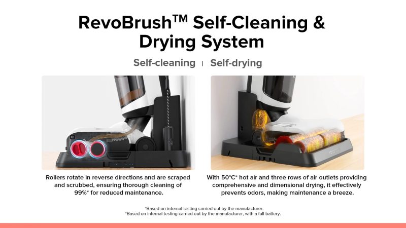 Questa lavapavimenti infatti dispone anche di una base di ricarica e auto-pulizia: il sistema RevoBrush pulisce i rulli con il mop, mentre l’aria calda a 50°C garantisce un’asciugatura completa.