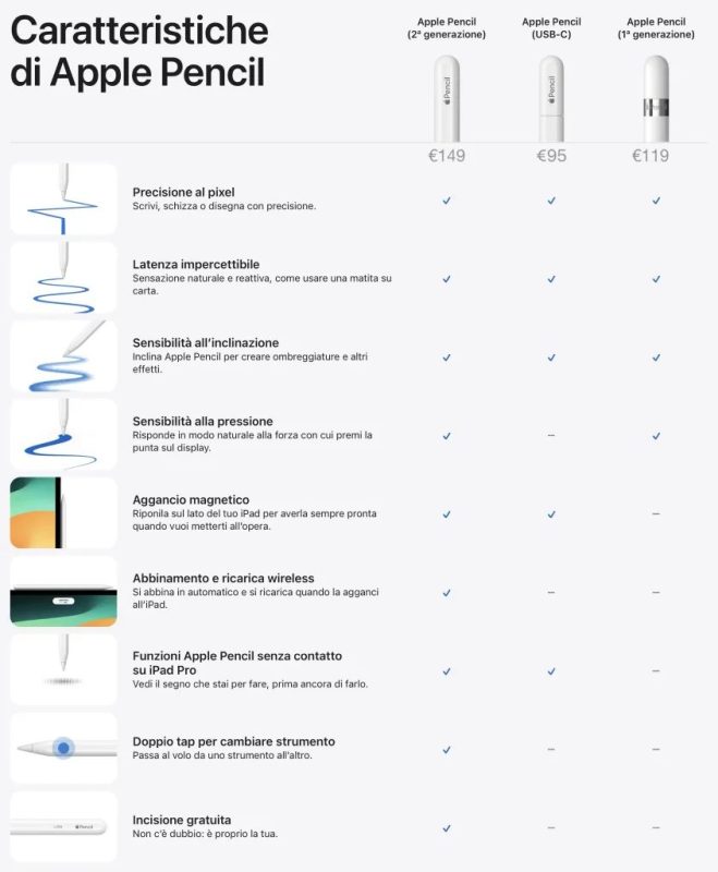 Ecco una tabella che mette a confronto i 3 modelli di Apple Pencil: