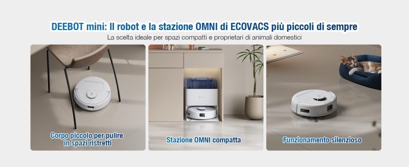 Scopri DEEBOT mini: robot aspirapolvere ECOVACS da 9000Pa, ultra compatto e silenzioso con stazione OMNI. In offerta lancio a 399€ fino al 14 luglio