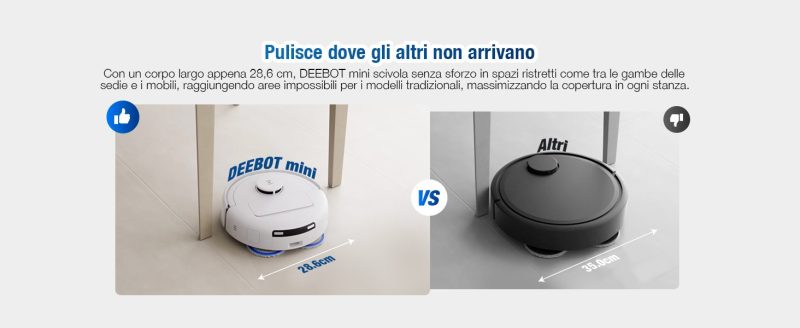 ECOVACS DEEBOT mini è il nuovo robot aspirapolvere compatto pensato per chi desidera un dispositivo potente ma salvaspazio, capace di adattarsi agli ambienti più piccoli senza rinunciare a prestazioni elevate.