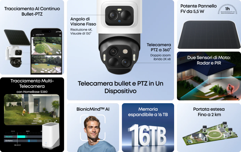 eufy sfida tutti: eufyCam S4 è la prima telecamera tri-cam ibrida (Bullet 4K + PTZ 2K) con AI 360° e pannello solare. Sicurezza top, zero stress