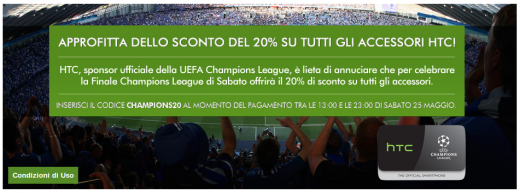 In occasione della finale di Champions League, competizione di cui HTC è sponsor, l'azienda offre il 20% di sconto a tutti gli utenti sugli accessori smartphone che sono acquistabili sul suo sito ufficiale.
