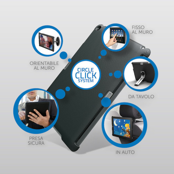 Con il Circle Click System sarà possibile ruotare e consultare il tablet grazie alla presa sicura con mano, oppure attaccarlo al muro e ad altre superfici in casa o in ufficio, appoggiarlo su qualsiasi superficie piana per scrivere, guardare video e per l’utilizzo come photo frame, o ancora agganciarlo al poggiatesta per godere del tablet durante gli spostamenti in auto. Insomma, c'è una soluzione praticamente per tutte le esigenze!