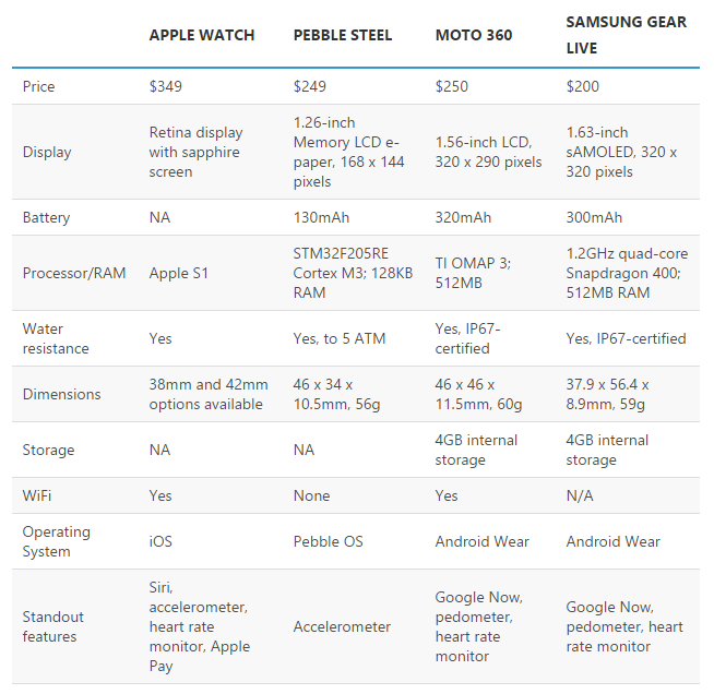 Ecco di seguito la tabella che confronta Apple Watch, Moto 360, Pebble Steel e Samsung Gear Live. Fammi sapere quale preferisci!