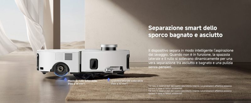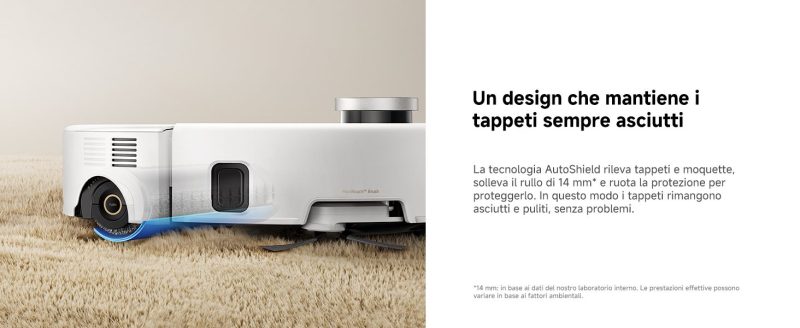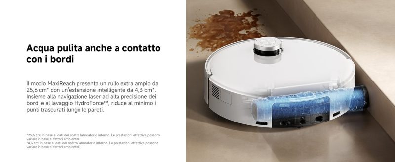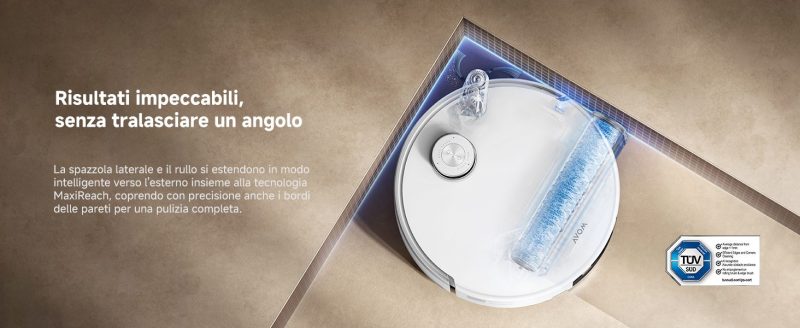 Entrambi i modelli sono dotati di spazzole laterali estensibili e rulli che si sviluppano oltre il telaio del robot, lavorando in perfetta sincronia con il sistema di navigazione laser che elimina polvere e detriti nascosti nelle zone difficili da raggiungere - assicurando una pulizia completa dei bordi che i robot convenzionali spesso non riescono a raggiungere.