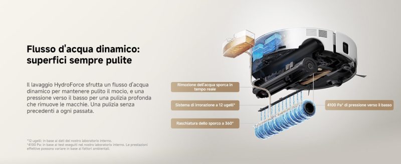- Una pressione verso il basso di 4100 Pa (circa 1,7 kg) imita lo strofinamento manuale per rimuovere in un unico passaggio le macchie secche e lo sporco ostinato