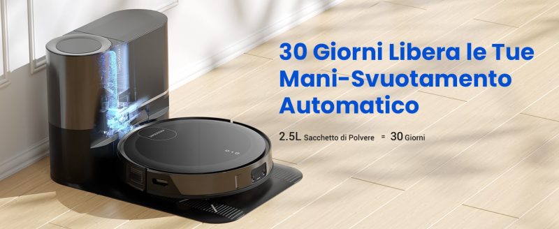 Dotati di un sacchetto per la polvere da una capienza di 2,5L e di un serbatoio dell'acqua da 250 ml, i nuovi robot aspirapolvere intelligenti di Proscenic garantiscono una pulizia della casa fino a 30 giorni consecutivi.