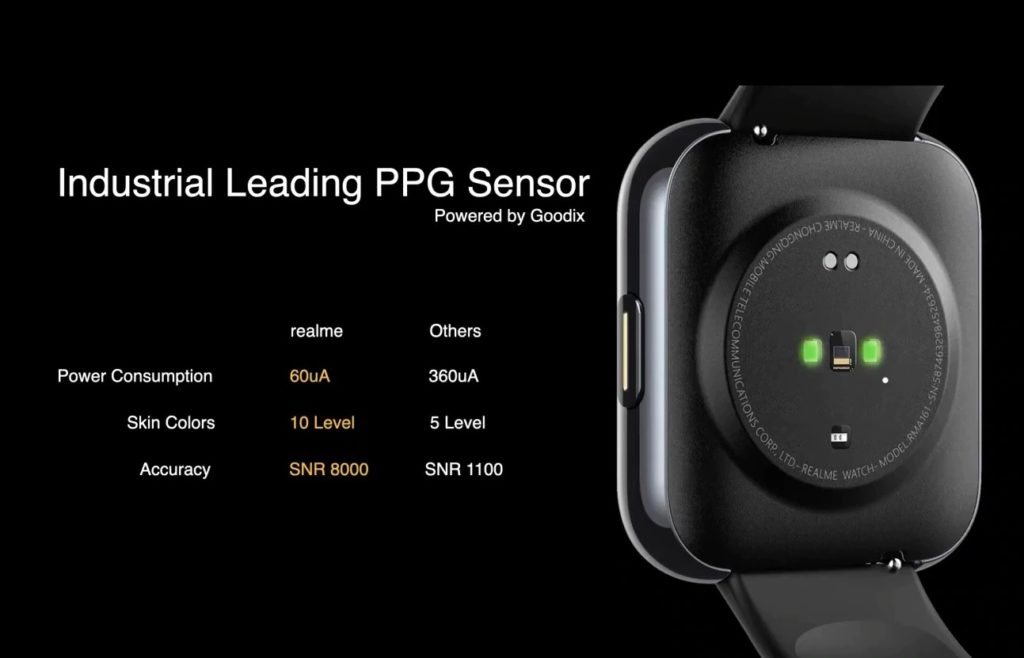 A proposito del sensore PPG prodotto da Goodix di cui è dotato, Realme è scesa molto nel tecnico specificando che questo modello consuma molto meno di quelli della concorrenza e che è in grado di distinguere 10 diverse tonalità del colore della pelle.