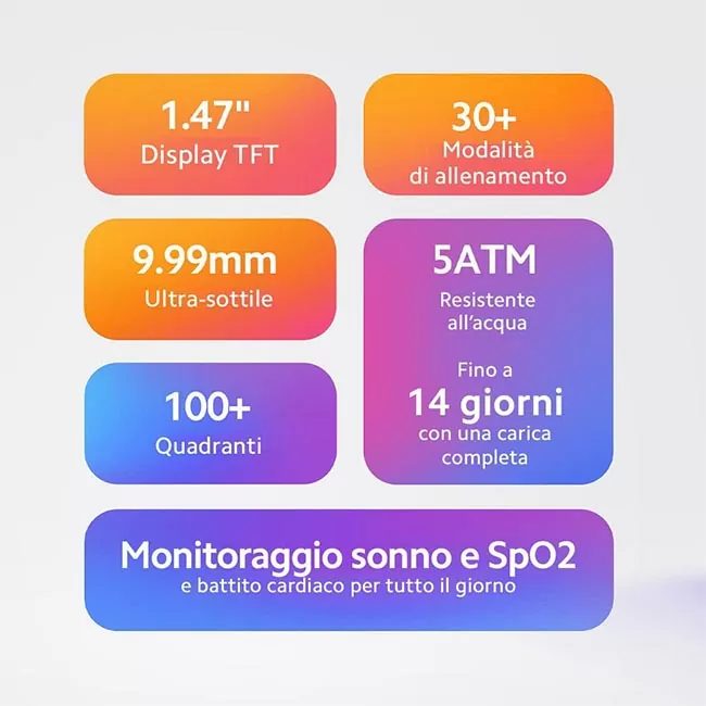 - funzioni: 30+ modalità allenamento, frequenza cardiaca, monitoraggio sonno, livello SpO2