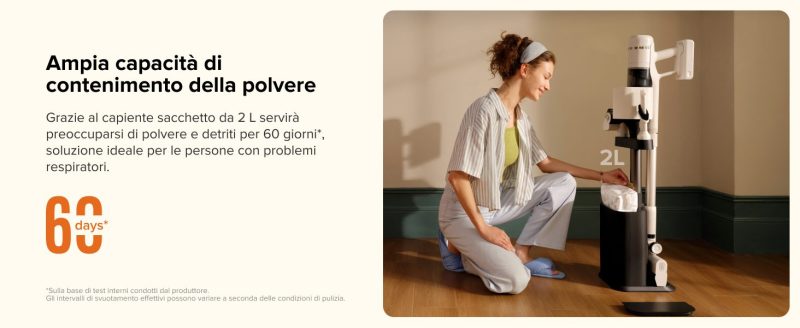 H60 Hub supporta sacchetti per la polvere della capacità di 2 litri, fornendo fino a 60 giorni di autonomia, mentre la rimozione batterica è garantita al 99%, seppur in un modello leggero e di facile manovrabilità.