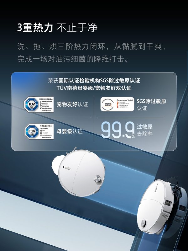 - Lavaggio dei panni a 100°C: La base del robot lava i panni con acqua a 100°C, eliminando grassi, biofilm e raggiungendo un tasso di rimozione batterica del 99,99%. C'è anche un'opzione di "triplo lavaggio" per lo sporco più ostinato