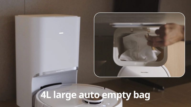 Passando alla raccolta della polvere, Switchbot S10 ha una potenza di aspirazione molto potente da 6.500 Pa, e la base auto svuotante è grande a sufficienza per contenere 70 giorni di sporcizia (sacchetto da 4 L).