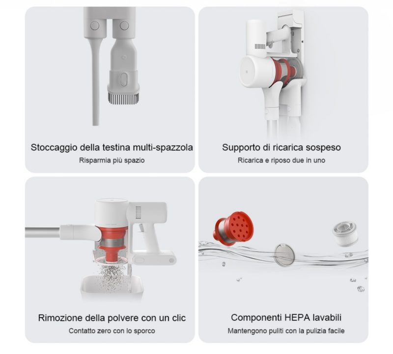 Infine, l’aspirapolvere viene fornito di una varietà di testine per pulire sia tappeti che tutti gli angoli di casa così da permettere una pulizia completa.