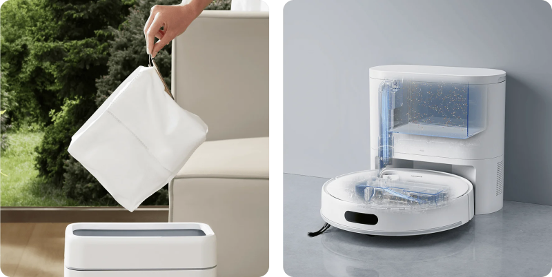 Con un capiente sacchetto da 4 litri, il robot può svuotare automaticamente il serbatoio della polvere dopo ogni sessione. Questo sistema garantisce fino a 90 giorni di pulizia a mani libere, rendendo la manutenzione un'operazione da fare solo una volta ogni 3 mesi.