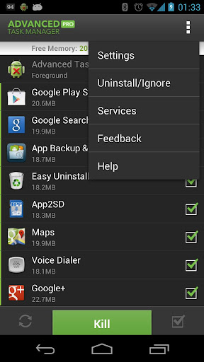 You may found that some apps are restarted again and again after killing, for some tasks are restarted by system events automatically. And we suggest that you enable Auto Kill in settings. Then it will kill tasks on every screen off. It will help to save battery and extend the battery life by terminating some apps that drawns too much battery.