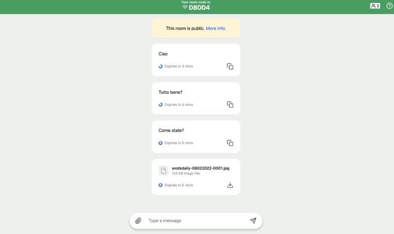 Unico neo: tutto quello che viene caricato nella stanza viene eliminato dopo 5 minuti, quindi va scaricato in fretta sugli altri dispositivi o dagli altri utenti.