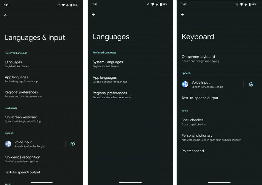 La pagina Lingue e immissione sotto Sistema è ora divisa in due pagine separate, Lingue e tastiera. Qui sotto a sinistra vedete la soluzione della prima beta e sotto le due pagine come si presentano nella seconda beta.