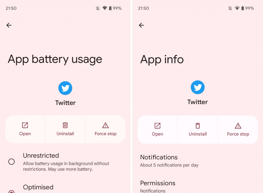 Nella pagina di informazioni su un'app, l'icona del cestino per la disinstallazione è ora più semplice e lineare. A sinistra come appare nella prima beta di Android 14 e a destra nella seconda beta.