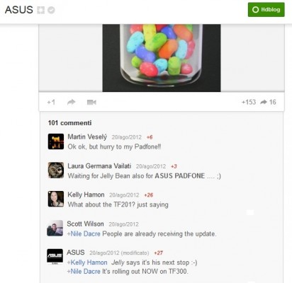Al momento la conferma non viene data ufficialmente, ma arriva come risposta ad un utente che ha chiesto sulla pagina Google Plus di ASUS se e quando Jelly Bean sarebbe arrivato su Asus Transformer TF201. La risposta dell'azienda è stata un pò vaga, ma comunque affermativa.
