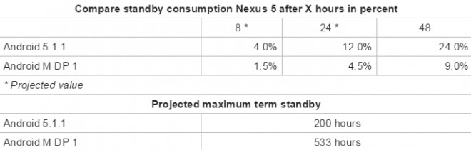 Stando ai primi test effettuati su Nexus 5 aggiornato ad Android M, la promessa fatta da Google è stata effettivamente mantenuta. In standby, infatti, Android M consuma molta meno batteria e di conseguenza la sua autonomia è aumentata in modo importante.
