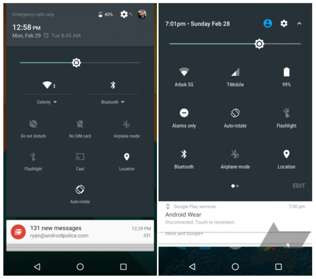 Come potete notare dall'immagine ad inizio articolo, tra le tante novità di Android N troveremo una nuova schermata e tendina per le notifiche, che ovviamente comprende anche i Quick Settings. Bisogna notare che NON si tratta di screen reali, ma di immagini realizzate sulla base di quello che i ragazzi di AndroidPolice hanno visto. Sono immagini molto vicine alla realtà, ma NON sono screenshot reali di Android N, che comunque apparirà in questo modo una volta che sarà rilasciato.