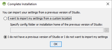 Al primo avvio selezionare I do not have a previous version of Android Studio or I do not want to import my settings se non avete mai installato Android Studio oppure la prima voce per importare i dati di una precedente installazione.