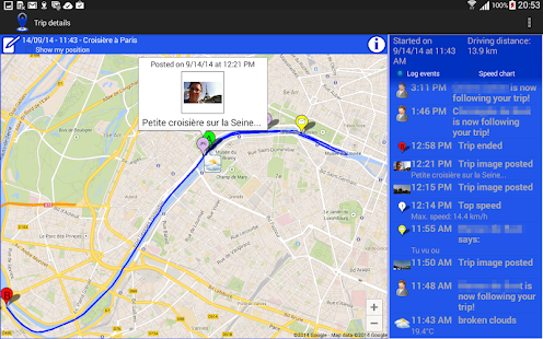 Share your travels by SMS, on social networks, check the statistics of the trip: speed, average speed, distance. New: a chart shows your speed evolution a graphical way!