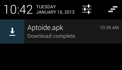 1. Scarica il file APK di Aptoide dal link in fondo all'articolo, e una volta terminato il Download del file APK se lo scarichi dal PC copialo nel tuo Smartphone o Tablet e installalo tramite un comune file Manager come Astro o File Explorer oppure se lo scarichi direttamente dal tuo Dispositivo procedi all'installazione diretta cliccando sul file APK direttamente nella barra delle notifiche.