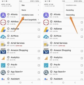 - Selezionare la vista che ordina le app in base alla data di installazione. Per fare questo, imposta i parametri su Installation date e Descending