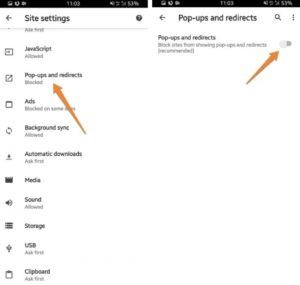 - Nella schermata che si apre, cliccare su Popup e reindirizzamenti e assicurati che lo slider sia grigio (quindi disattivato). Se è blu, cliccaci sopra per farlo diventare grigio