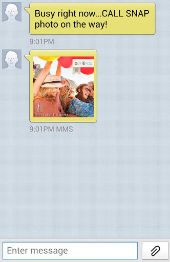 CallSnap è un programma simpatico, semplice e sicuramente innovativo da usare quando non potete rispondere al telefono. Se, per qualsiasi motivo, siete occupati e non riuscite a prendere una chiamata, CallSnap risolverà i vostri problemi. Vi permetterà di scattare al volo una foto e di inviarla alla persona che vi sta cercando. Comodo e divertente!