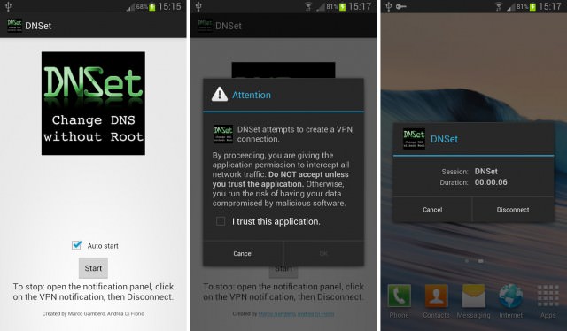 L'applicazione inoltre dopo aver creato la VPN si chiude automaticamente non consumando batteria preziosa. Utilizzare DNSet è semplice ed intuitivo poichè sarà sufficiente aprire l'applicazione e premere il bottone Start per avviare il servizio VPN.