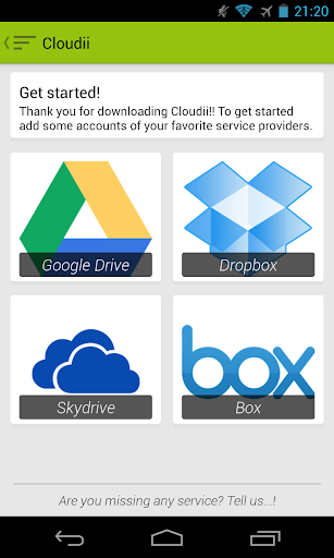 Il programma è facile da usare, offre un'interfaccia in pieno stile Holo e si adatta a smartphone e tablet, anche in HD o FullHD. Come abbiamo detto, Cloudii supporta tutti i principali servizi di cloud storage come: Dropbox, Skydrive, GDrive, Box e molti altri ancora. L’interfaccia è semplicissima, curata e l’accesso ai vari servizi cloud è davvero immediato.