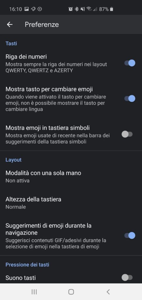 - da qui puoi iniziare a personalizzare la tastiera in base alle tue esigenze e preferenze. Per avere le emoji di iPhone su Huawei, però, devi andare in Preferenze e attivare la spunta su Mostra tasto per cambiare emoji