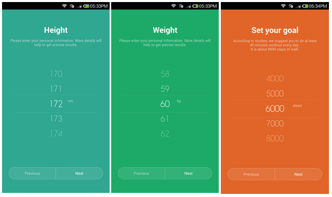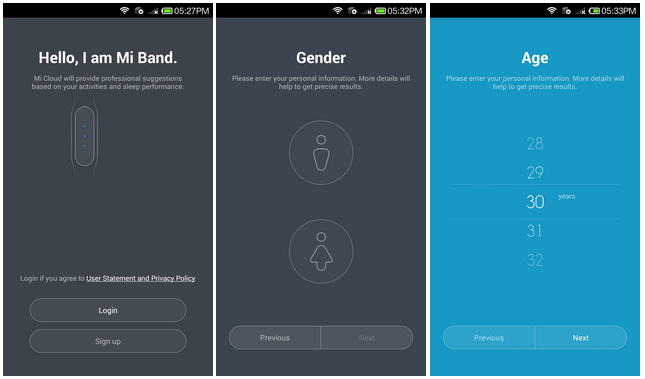 Nella prima schermata dell'app dovrete inserire i dati del vostro account MIUI: se non ne avete uno, potete crearlo gratuitamente. Fatto questo, nelle successive schermate dovrete inserire i vostri dati personali: età, altezza, peso, uomo/donna e il numero di passi che volete fare ogni giorno come obiettivo.
