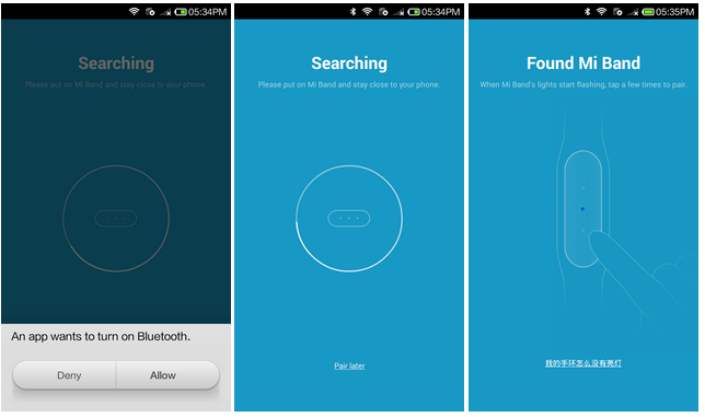 Ora dovrete collegare Xiaomi Mi Band al vostro Android: l'app vi chiederà il permesso di accendere il bluetoot (dateglielo) e successivamente, nel giro di pochi istanti, il vostro Xiaomi Mi Band inizierà ad illuminarsi. Tappate due volte velocemente con il dito la parte superficiale dello Xiaomi Mi Band e in pochi istanti il device sarà collegato al vostro Android.