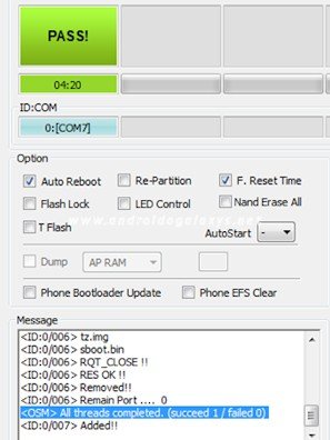 - l'installazione di Android 6.0.1 Marshmallow su Galaxy S6 richiede circa 10 minuti: durante questi minuti non fate nulla, aspettate semplicemente che la procedura venga portata a termine. L'operazione sarà conclusa quando vedrete la scritta PASS in Odin.