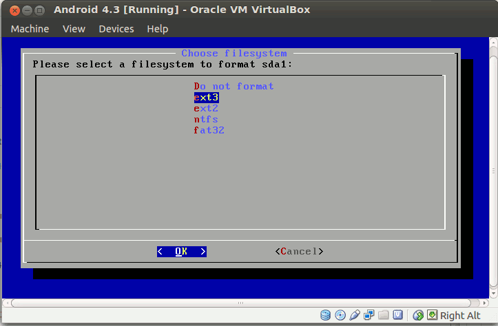 - Ora selezionare la partizione su cui installare Android e scegliere di formattarla nel formato ext3