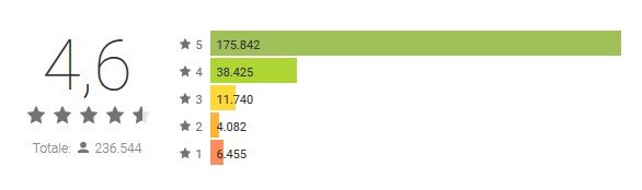 L'applicazione è molto votata sul Play Store e sono ben il 70% i voti a 5 stelle e il 18% a 4 stelle che denotano un alto livello di percezione da parte dell'utente ed un funzionamento ottimale.