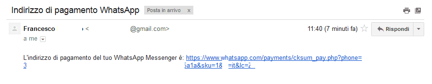 Infine se la procedura di pagamento precedente non fosse andata a buon fine potete utilizzare il sistema che invierà al vostro indirizzo Mail una indirizzo con cui pagare WhatsApp con PayPal dal vostro PC.